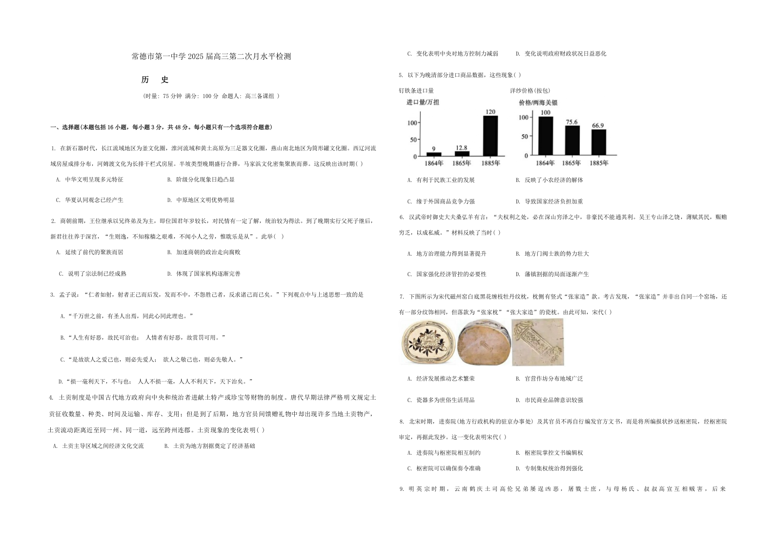 湖南省常德市第一中学2025届高三第二次月水平检测历史