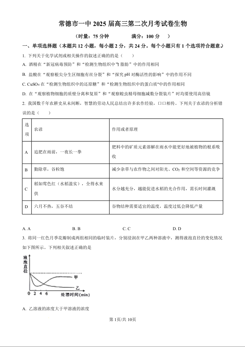 湖南省常德市第一中学2025届高三第二次月水平检测生物试题(原卷版)