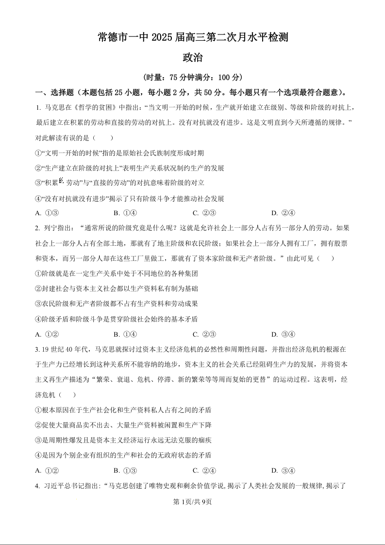 湖南省常德市第一中学2025届高三第二次月水平检测政治试题(原卷版)