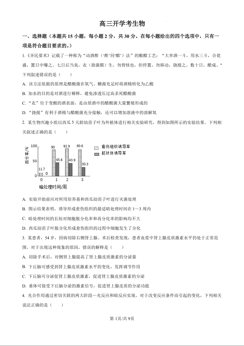 吉林省通化市梅河口市第五中学2025届高三上学期9月月考生物试题(原卷版)