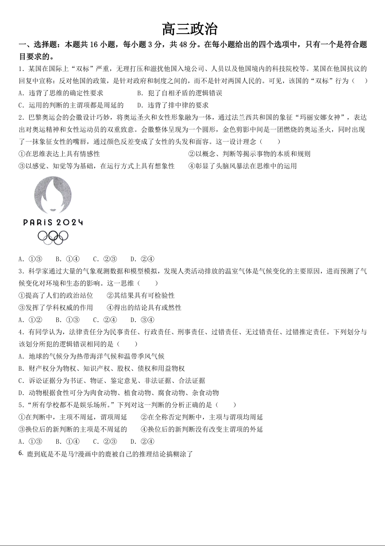 吉林省通化市梅河口市第五中学2025届高三上学期9月月考政治+答案