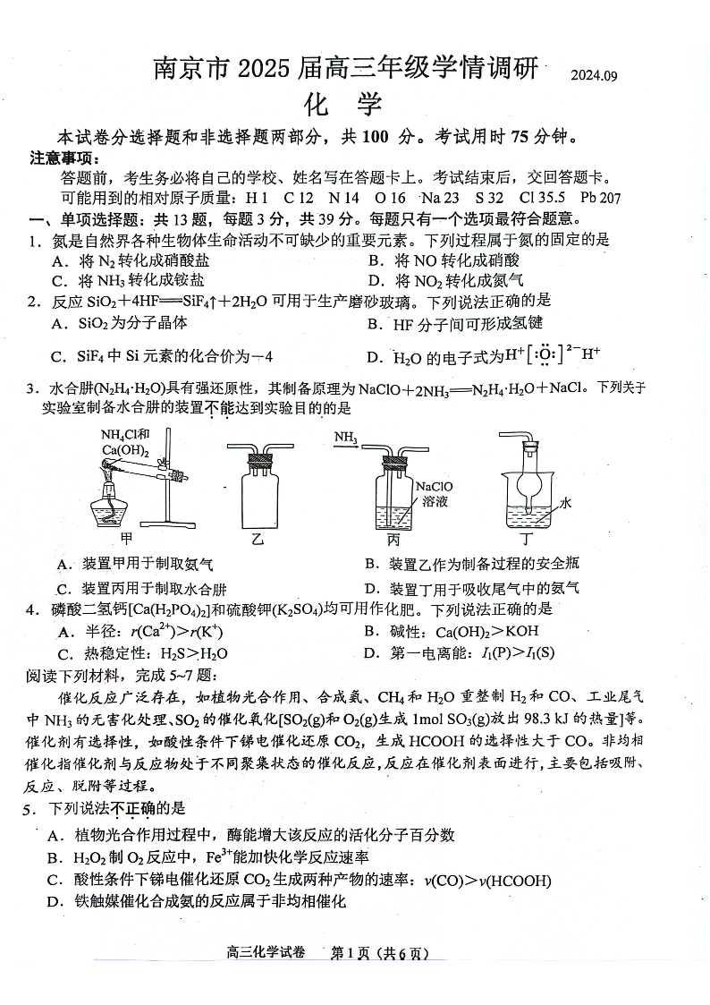 江苏省南京市2025届高三年级学情调研化学