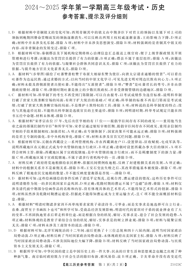 江苏省盐城市盐城八校2024-2025学年第一学期高三年级考试历史答案