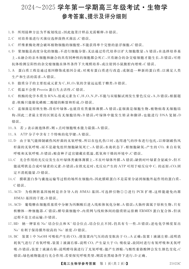 江苏省盐城市盐城八校2024-2025学年第一学期高三年级考试生物答案