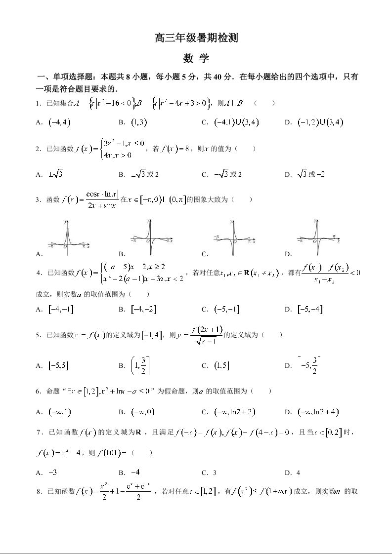 江苏省扬州中学2025届高三年级暑期检测数学+答案