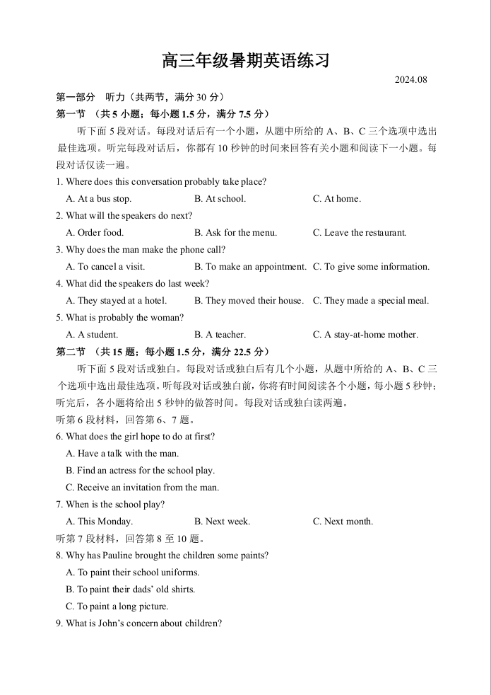 江苏省扬州中学2025届高三年级暑期检测英语+答案