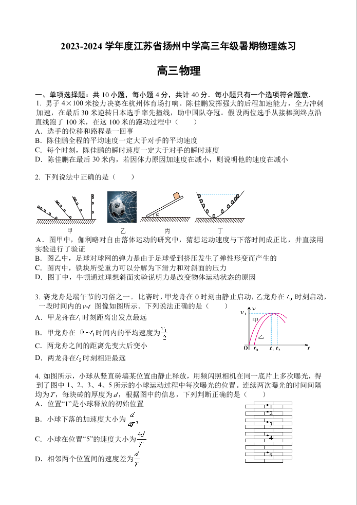 江苏省扬州中学2025届高三年级暑期检测物理+答案