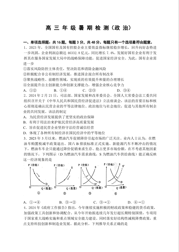 江苏省扬州中学2025届高三年级暑期检测政治+答案