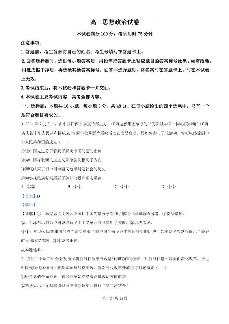 江西省部分高中2025届高三9月开学考试政治试题(解析版)