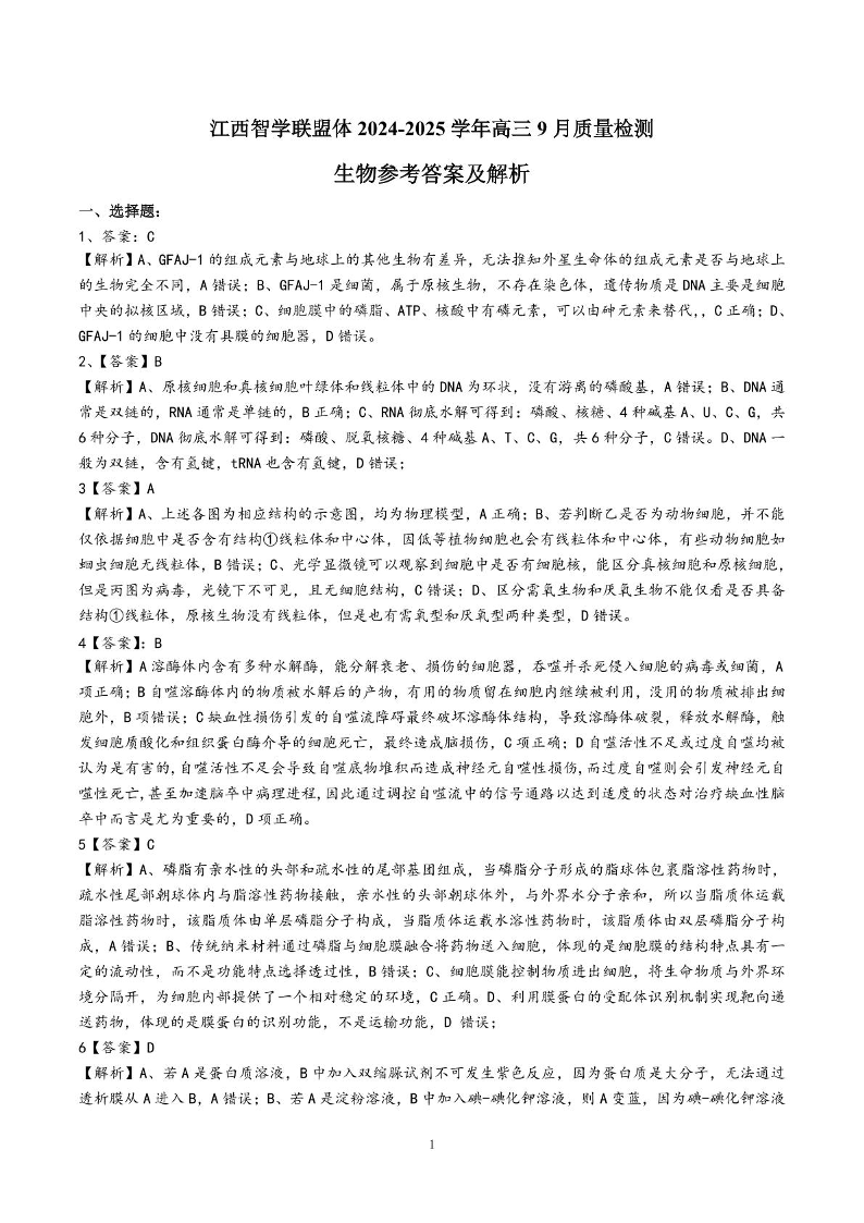 江西智学联盟体2024-2025学年高三9月质量检测 生物答案