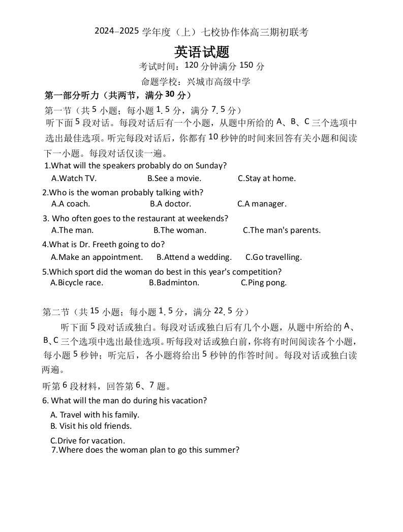 辽宁省2024-2025学年度(上)七校协作体高三期初联考英语