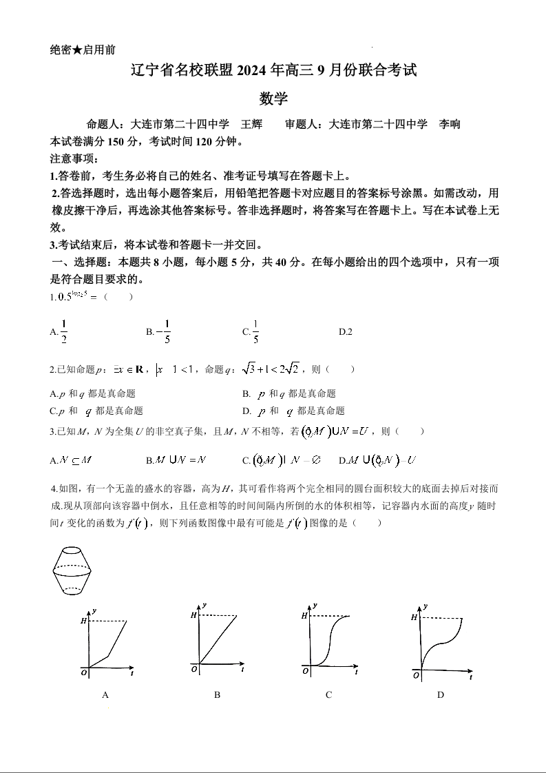 辽宁省名校联盟2024年高三9月份联合考试数学+答案