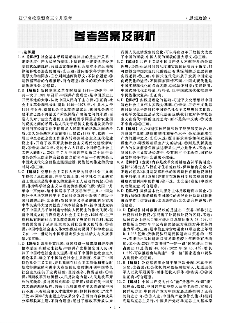 辽宁省名校联盟2024年高三9月份联合考试政治答案