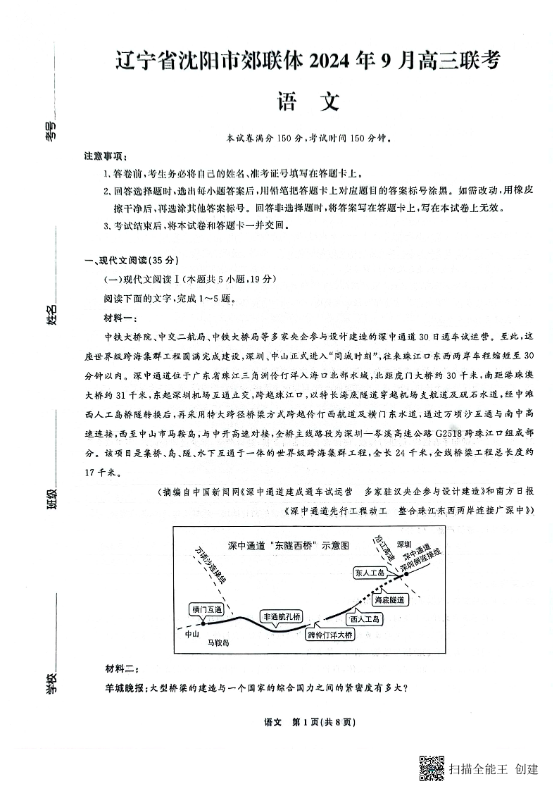 辽宁省沈阳市郊联体2024年9月高三联考语文+答案