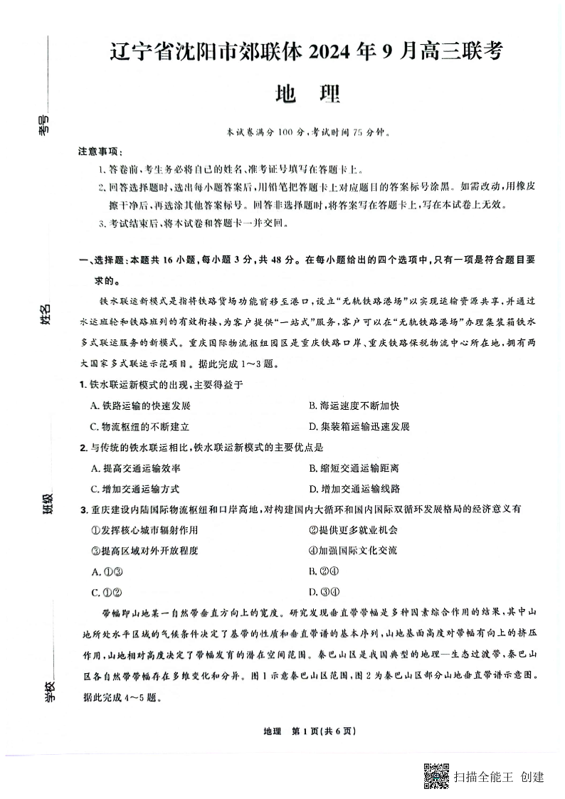 辽宁省沈阳市郊联体2024年9月高三联考地理+答案