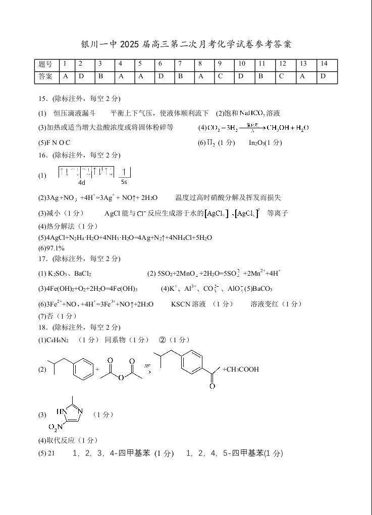 宁夏银川一中2025届高三上学期第二次月考化学答案