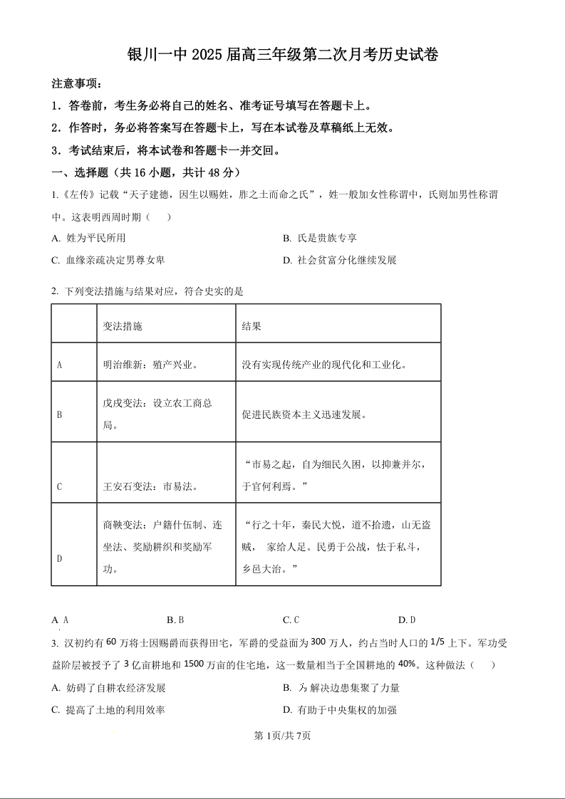宁夏银川一中2025届高三上学期第二次月考历史试卷(原卷版)