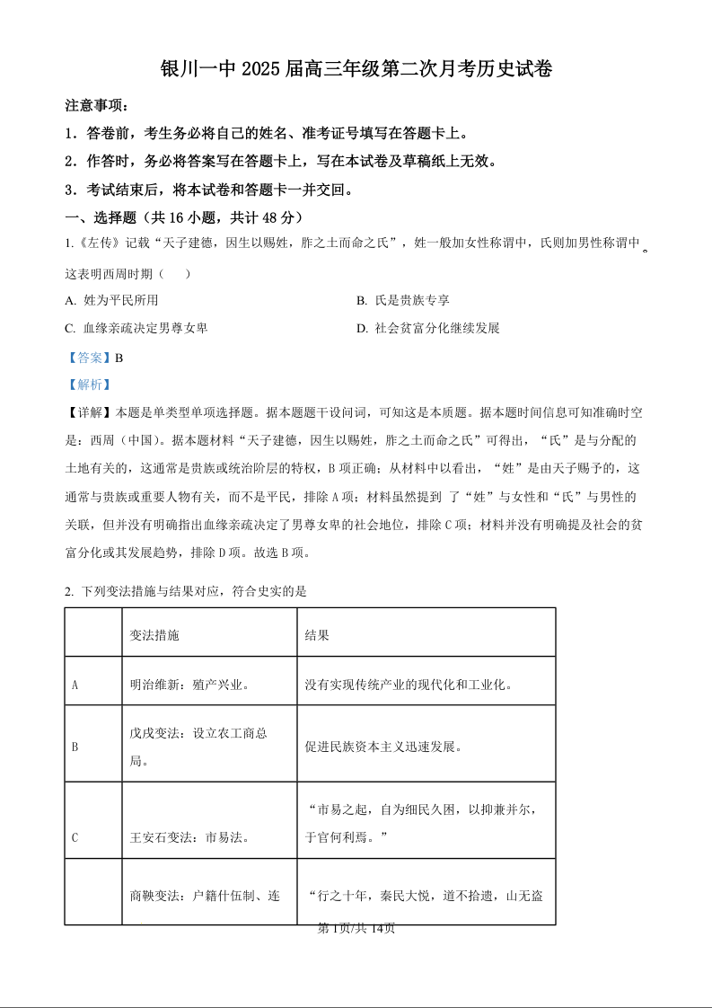 宁夏银川一中2025届高三上学期第二次月考历史试卷(解析版)