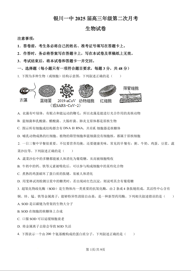 宁夏银川一中2025届高三上学期第二次月考生物试卷(原卷版)