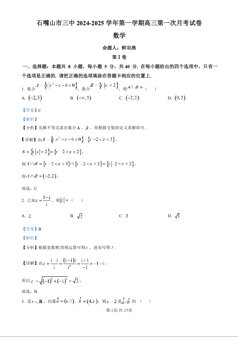 宁夏回族自治区石嘴山市第三中学2024-2025学年第一学期高三第一次月考试卷数学试题(解析版)