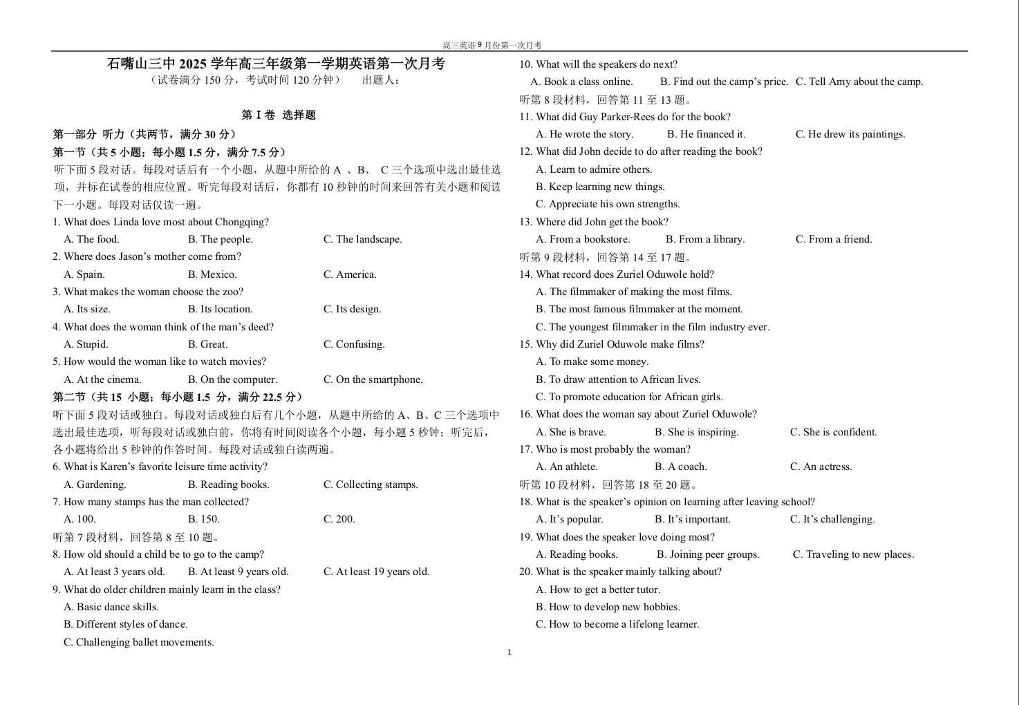 宁夏回族自治区石嘴山市第三中学2024-2025学年第一学期高三第一次月考试卷英语
