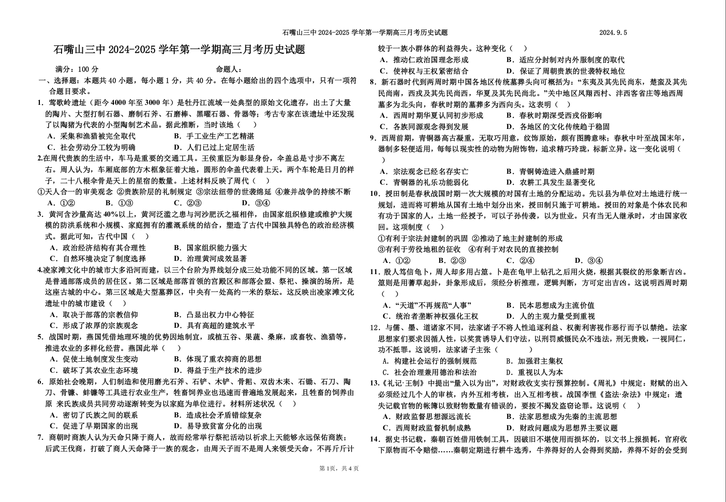 宁夏回族自治区石嘴山市第三中学2024-2025学年第一学期高三第一次月考试卷历史