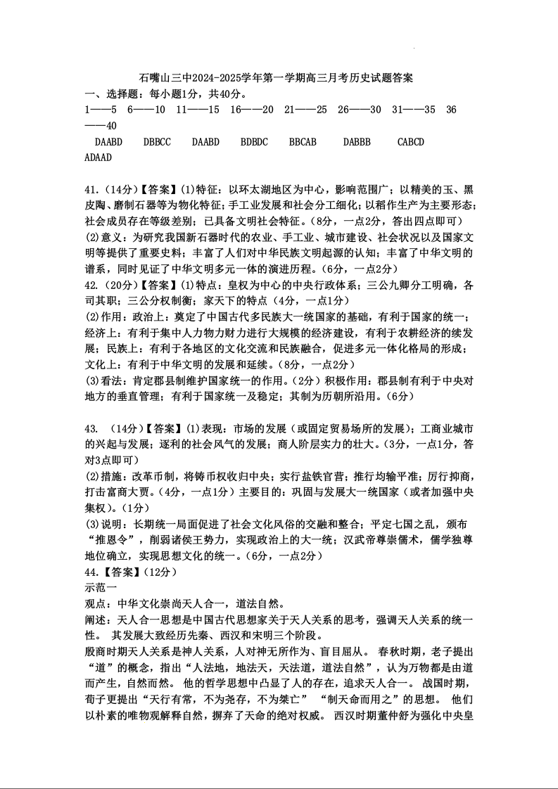 宁夏回族自治区石嘴山市第三中学2024-2025学年第一学期高三第一次月考试卷历史答案