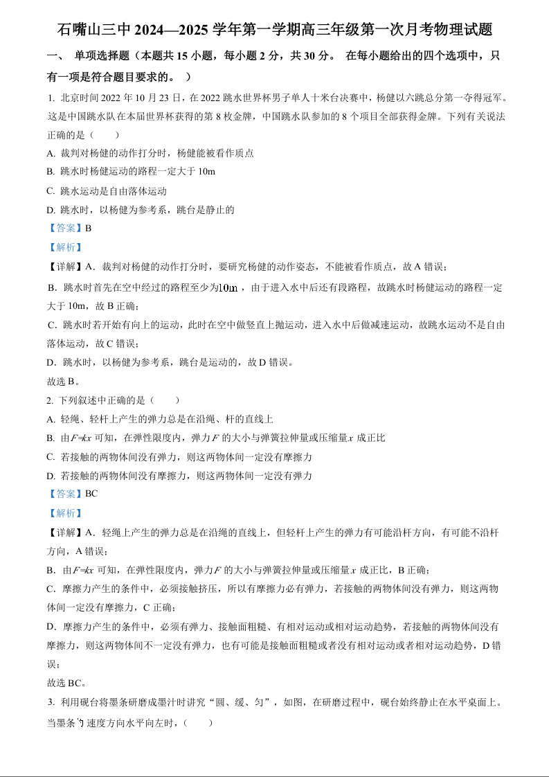 宁夏回族自治区石嘴山市第三中学2024-2025学年第一学期高三第一次月考试卷物理试题(解析版)