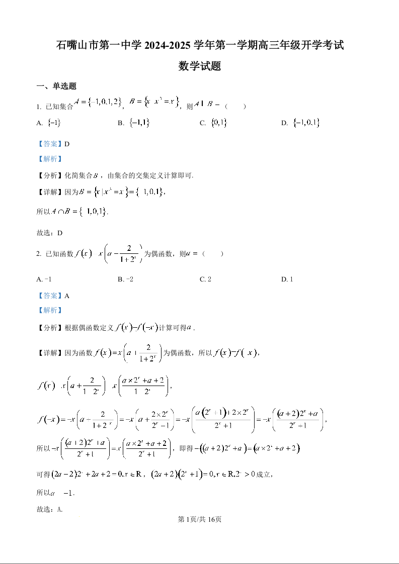 宁夏回族自治区石嘴山市第一中学2024-2025学年度高三年级开学测试数学试题(解析版)