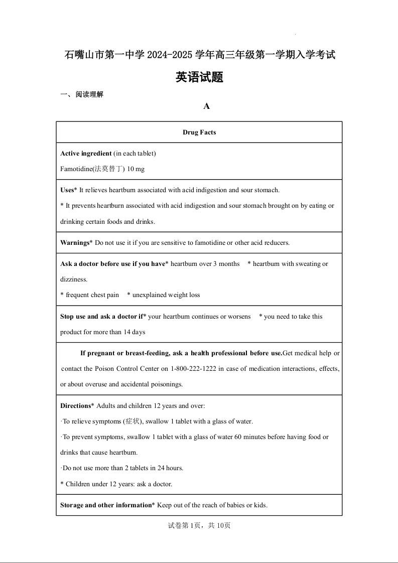 宁夏回族自治区石嘴山市第一中学2024-2025学年度高三年级开学测试英语