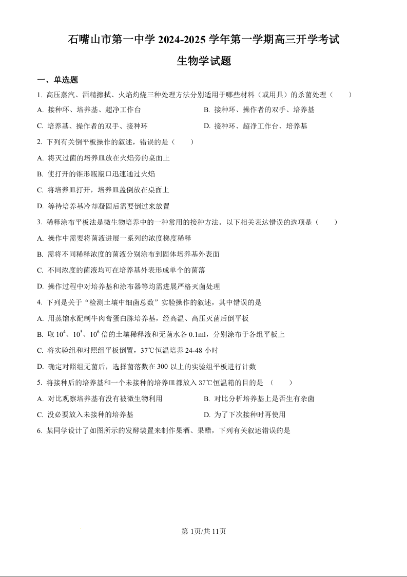 宁夏回族自治区石嘴山市第一中学2024-2025学年度高三年级开学测试生物试题(原卷版)