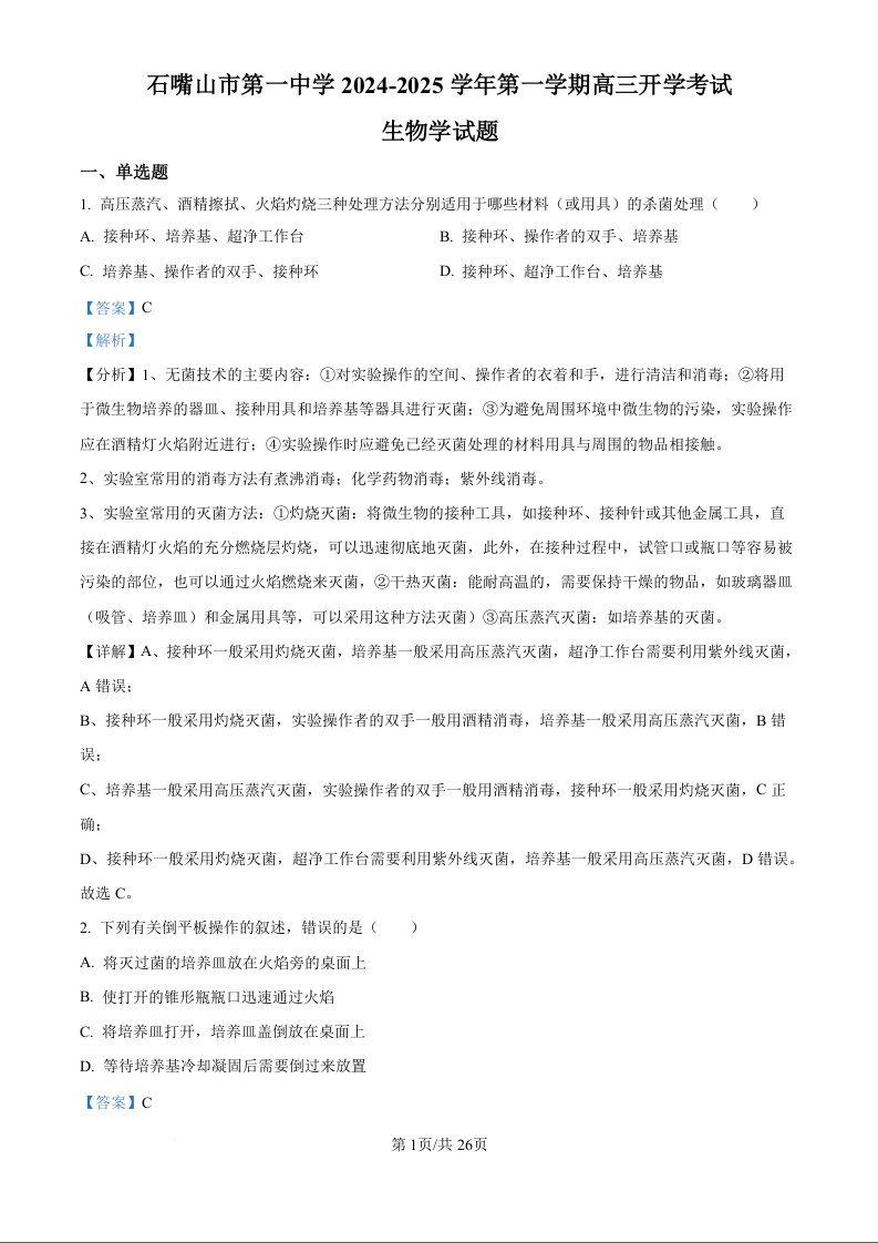 宁夏回族自治区石嘴山市第一中学2024-2025学年度高三年级开学测试生物试题(解析版)