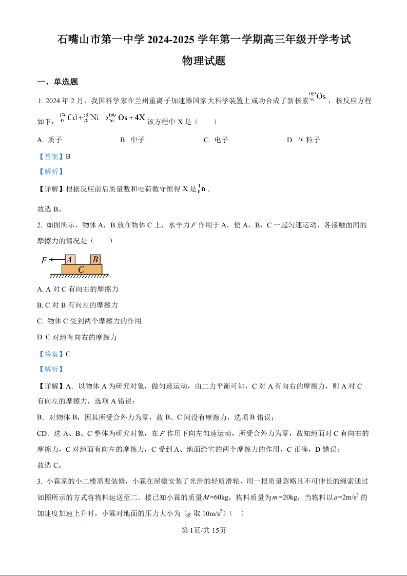 宁夏回族自治区石嘴山市第一中学2024-2025学年度高三年级开学测试物理试题(解析版)
