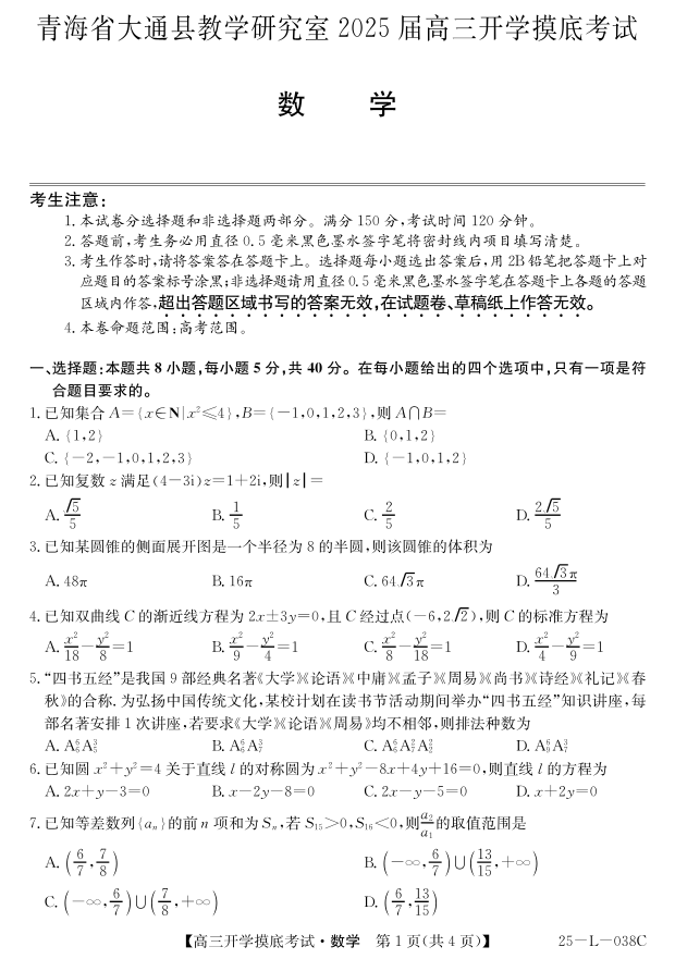 青海省西宁市大通县教学研究室2025届高三开学摸底考试数学