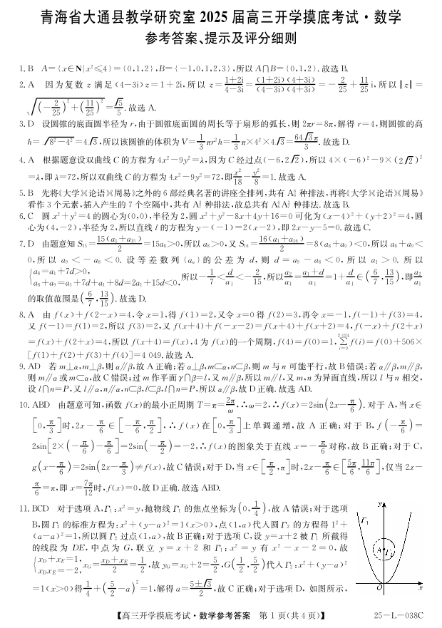 青海省西宁市大通县教学研究室2025届高三开学摸底考试数学答案