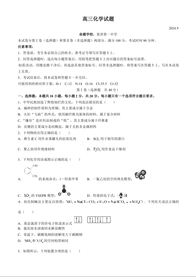 山东省德州市2025届高三上学期9月开学考试化学+答案