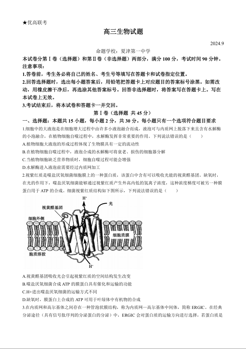 山东省德州市2025届高三上学期9月开学考试生物+答案