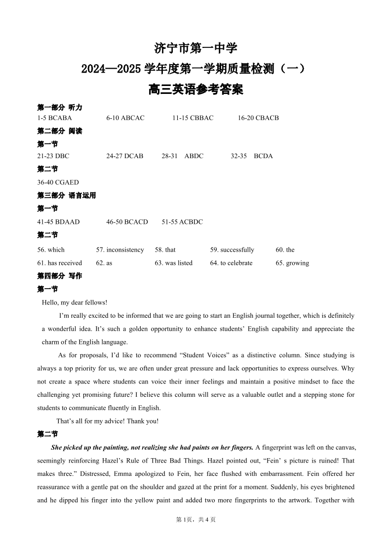山东省济宁市第一中学2024-2025学年度第一学期质量检测(一)英语答案