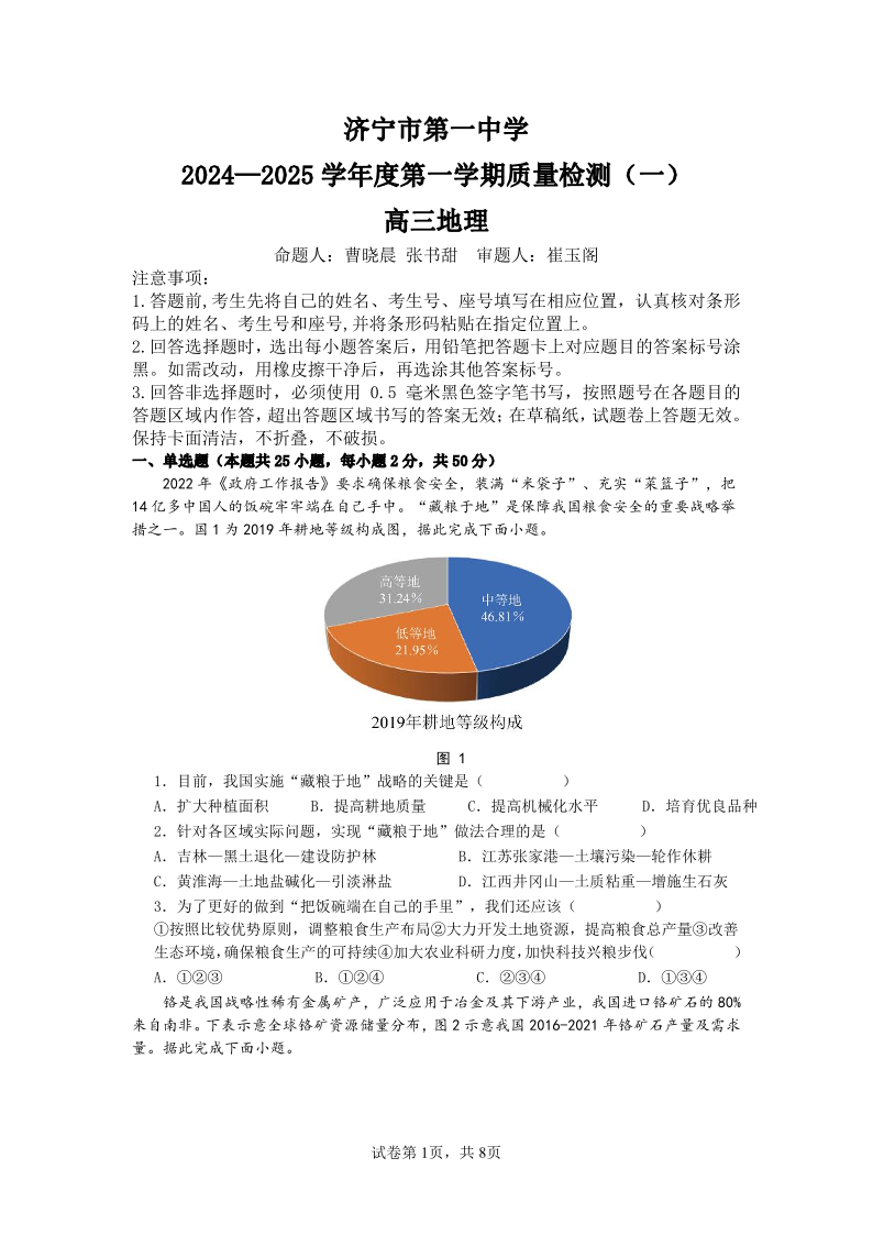 山东省济宁市第一中学2024-2025学年度第一学期质量检测(一)地理