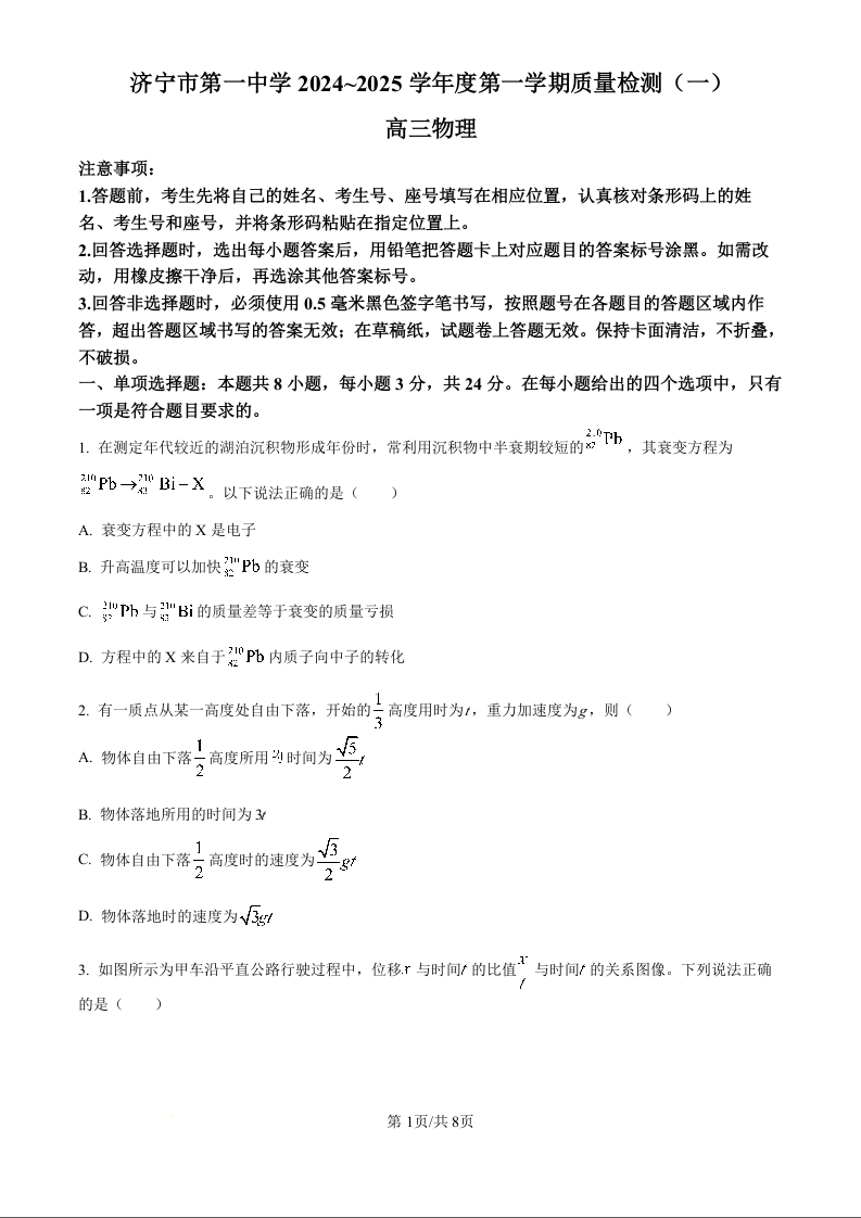 山东省济宁市第一中学2024-2025学年度第一学期质量检测(一)物理试题(原卷版)