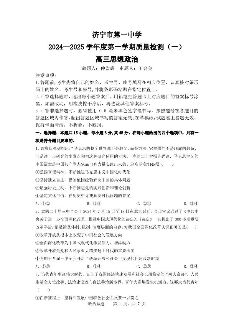 山东省济宁市第一中学2024-2025学年度第一学期质量检测(一)政治