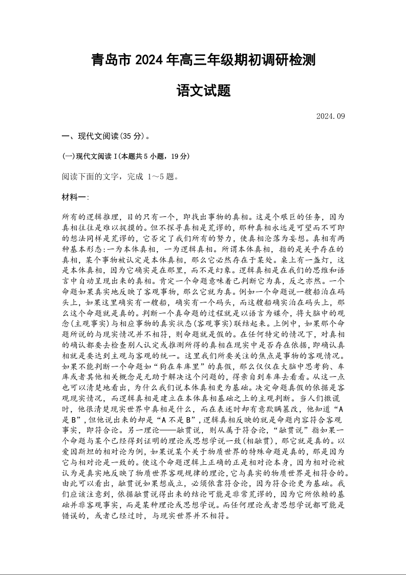 山东省青岛市2024年高三年级期初调研检测语文
