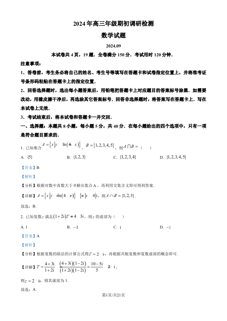 山东省青岛市2024年高三年级期初调研检测数学试题(解析版)