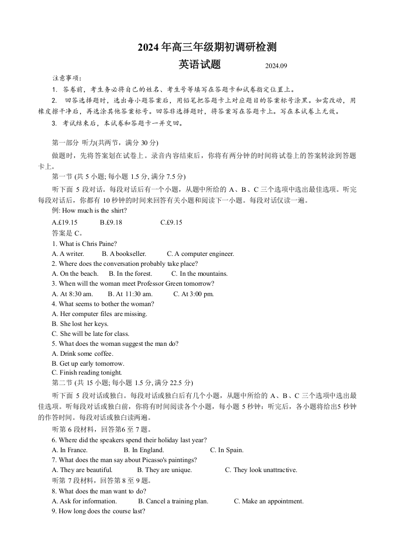 山东省青岛市2024年高三年级期初调研检测英语
