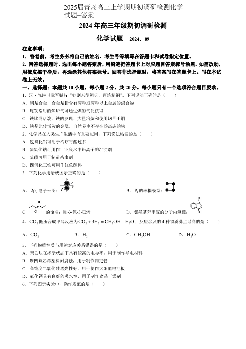 山东省青岛市2024年高三年级期初调研检测化学试题+答案