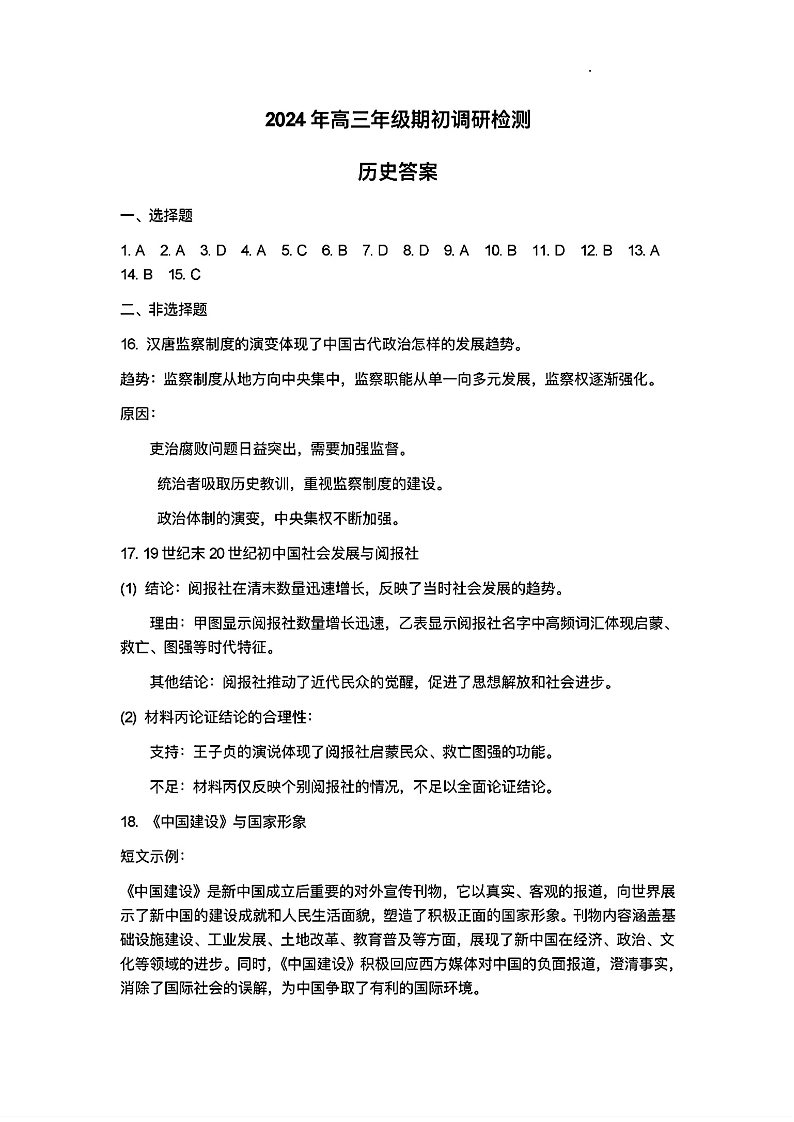 山东省青岛市2024年高三年级期初调研检测历史答案