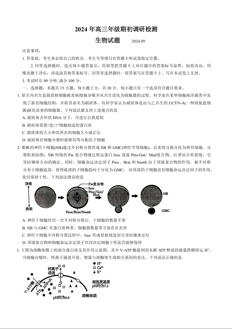 山东省青岛市2024年高三年级期初调研检测生物