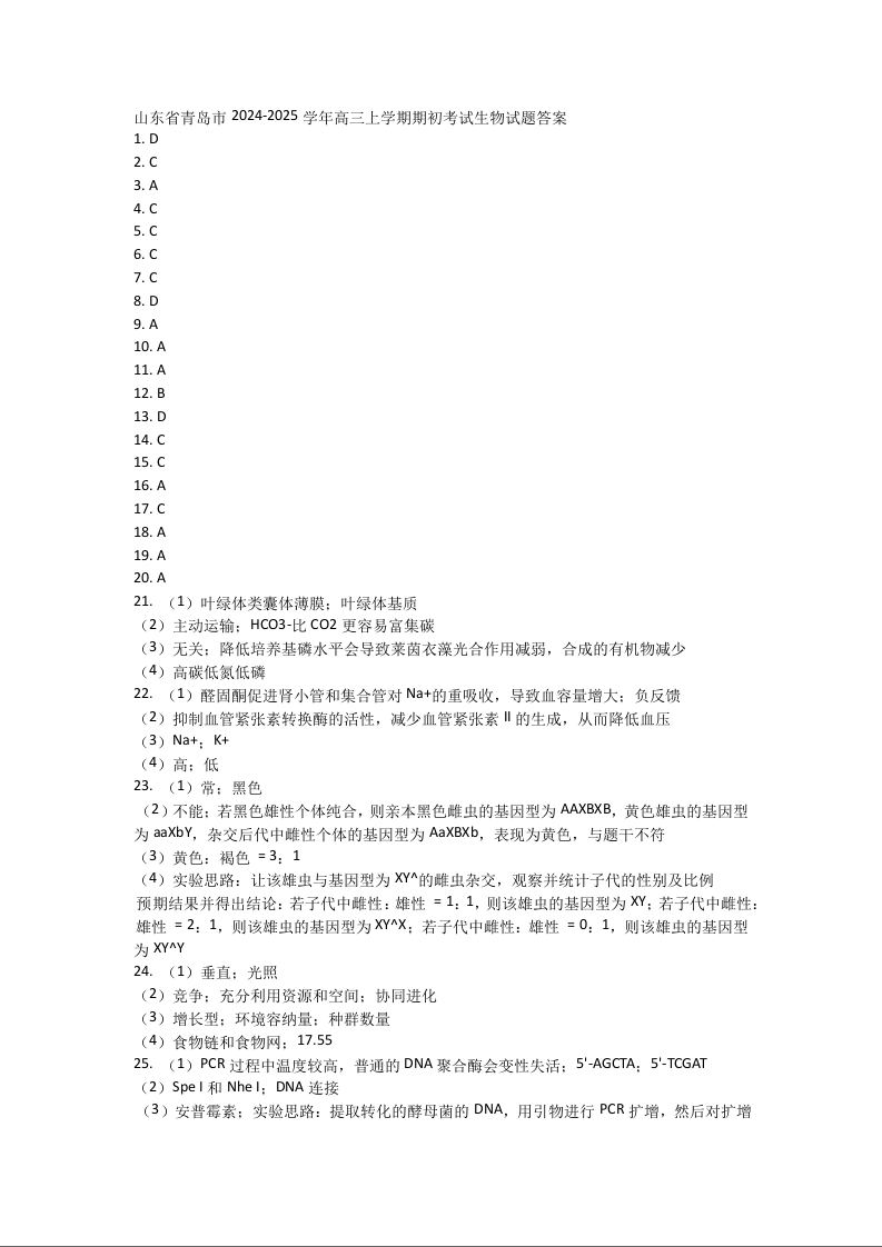 山东省青岛市2024年高三年级期初调研检测生物答案