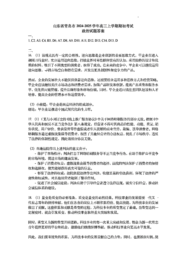山东省青岛市2024年高三年级期初调研检测政治答案