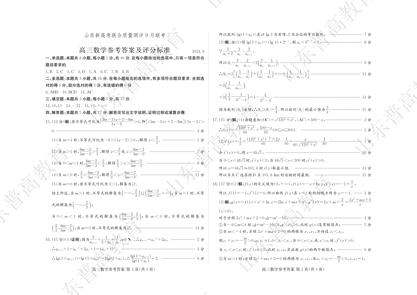 山东省新高考联合质量测评2025届9月联考试题数学答案